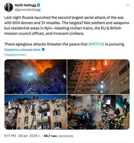 «Россия провела вторую по масштабу воздушную атаку за всю войну. Цели — не военные и техника, а жилые районы Киева. Пострадали гражданские поезда, офисы миссий ЕС и Великобритании, а также мирные жители», — написал Келлог в соцсети Х.